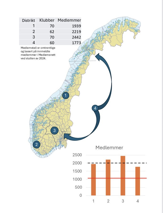 Alt er i endring, også Rotary. Organisasjonen med ca 1,4 millioner medlemmer verden over endres med at medlemstallet i deler av verden øker mens i vårt land går antallet ned. Et distrikt skal ha minst 1100 medlemmer og nå er vi under det antallet slik sitsuasjonen var i 2011. Den gang ble 2270 og mesteparten av 2280 slått sammen til D2275, 7 distrikt ble til 6. Nå må det gjøres et grep igjen og president Lars orienterte om det forslaget en arbeidsgruppe i regi av Norfo har lagt fram.